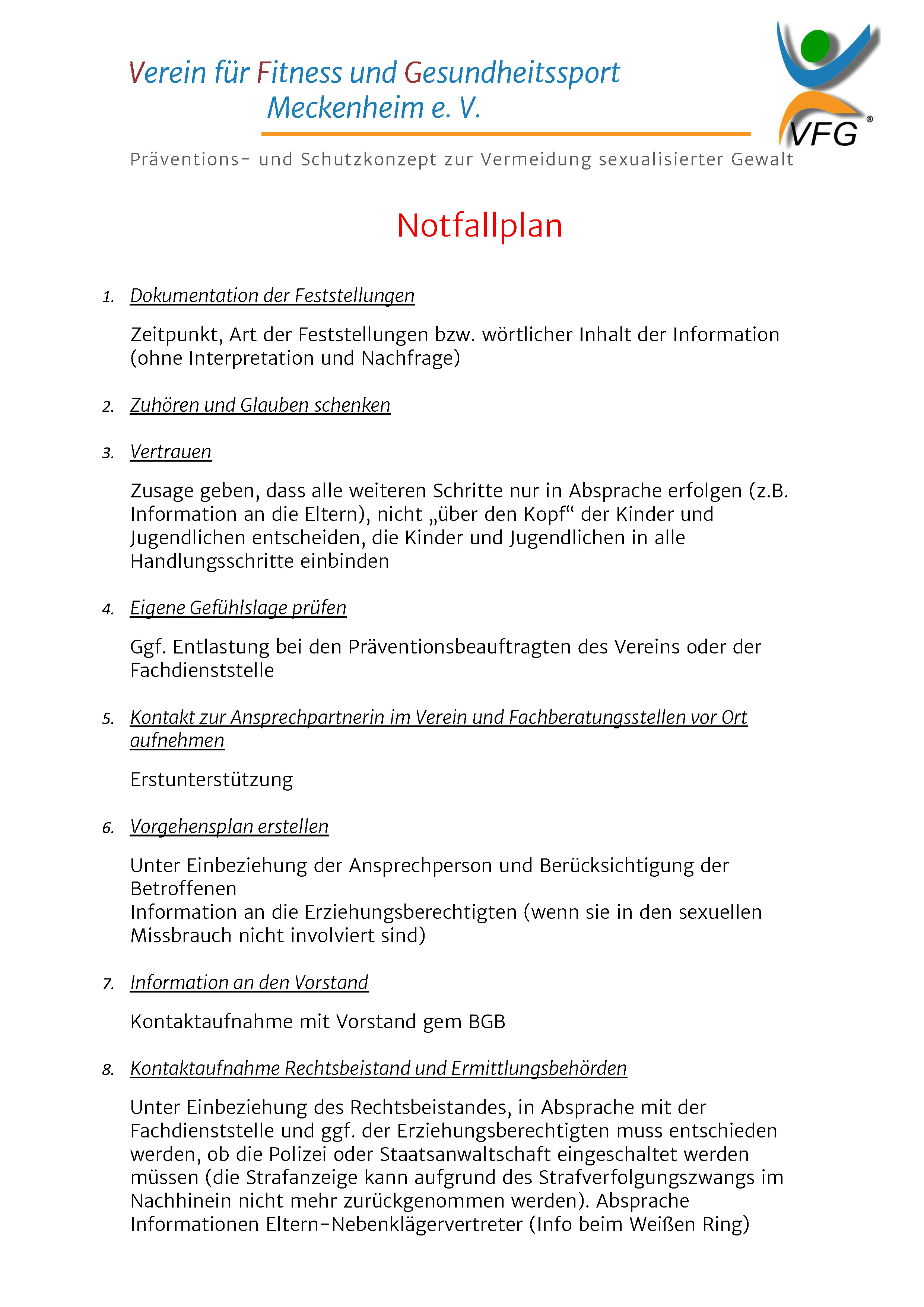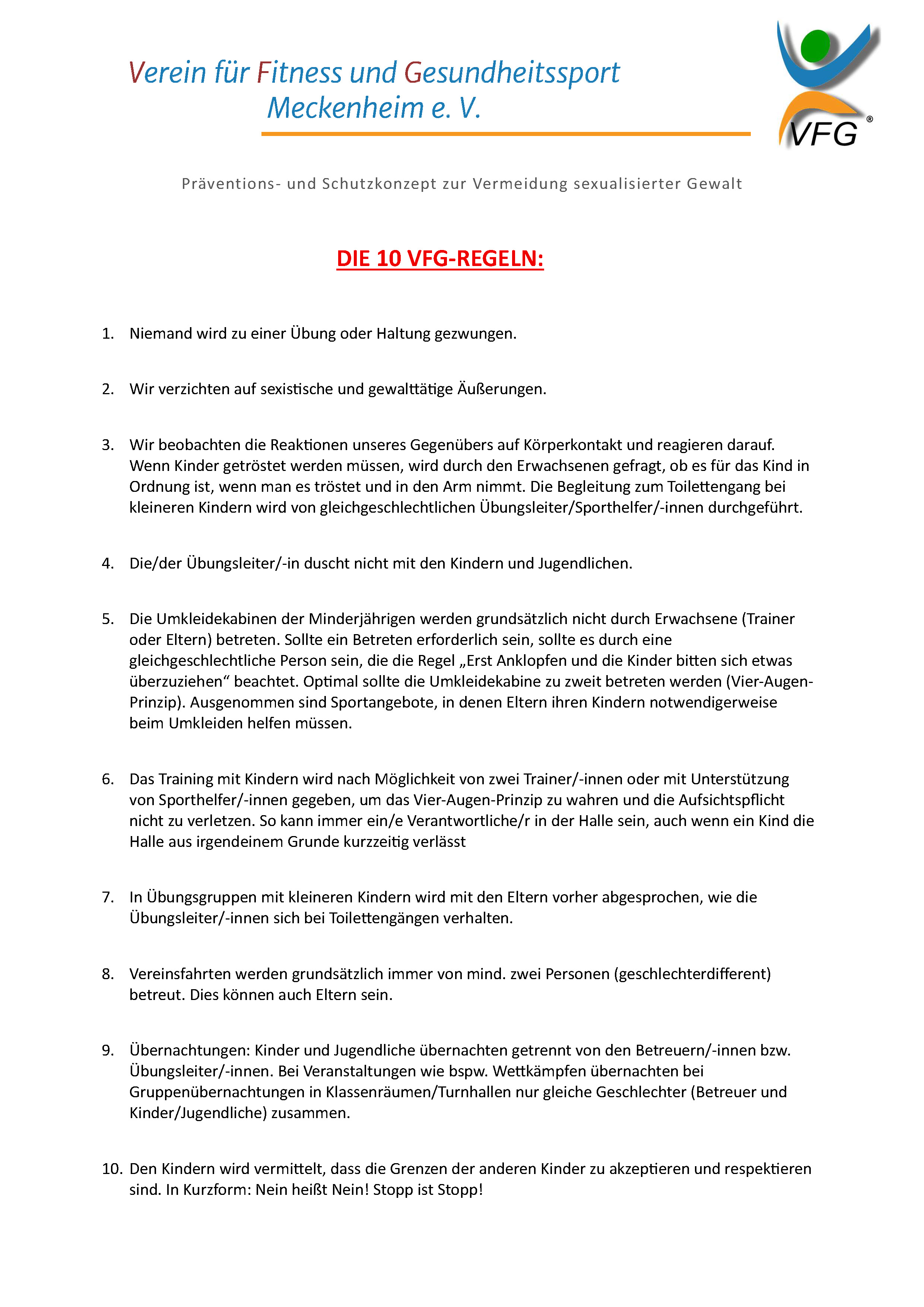 Alle im VFG Meckenheim tätigen Übungsleiter und Gruppenhelfer unterschreiben einen sog. „Ehrenkodex”, in dem sie sich grundsätzlich verpflichten, die Persönlichkeit der Schutzbefohlenen zu achten und deren Würde zu respektieren.